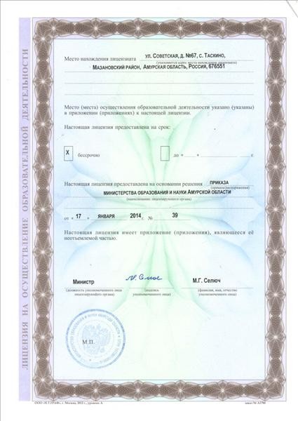 | Адрес местонахождения образовательной организации* | 676551, Амурская область, Мазановский район, с. Таскино, ул. Советская, д. № 67. |